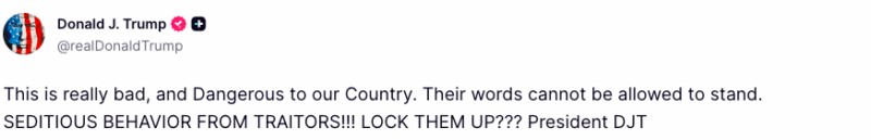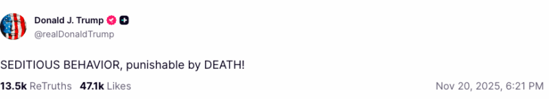 On November 20, 2025, President Donald Trump published a series of posts on his platform Truth Social targeting six Democratic lawmakers. He accused them of “seditious behavior” and wrote, “SEDITIOUS BEHAVIOR, punishable by DEATH!” He also called for their arrest and trial, writing, “Each one of these traitors … should be ARRESTED AND PUT ON TRIAL.” In addition, he reshared a supporter’s post stating: “Hang them George Washington would !!”
