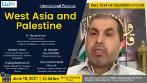 United World International has organized an international webinar on “West Asia and Palestine” with participation from Palestine, Turkey, Syria, Iran and Pakistan on June 10th, 2021. Today, we present the